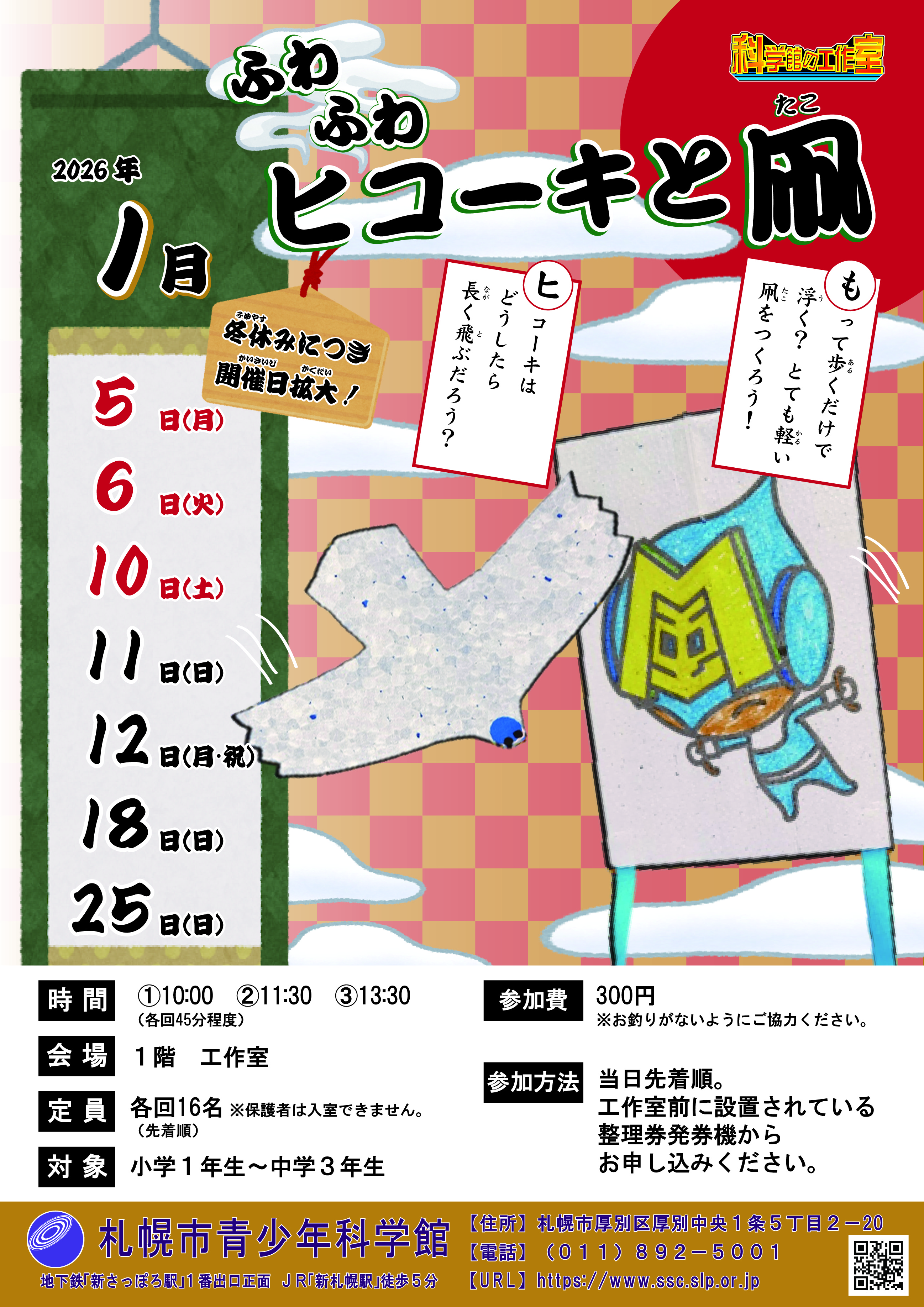 【冬休み・1月】科学館の工作室「ふわふわヒコーキと凧」